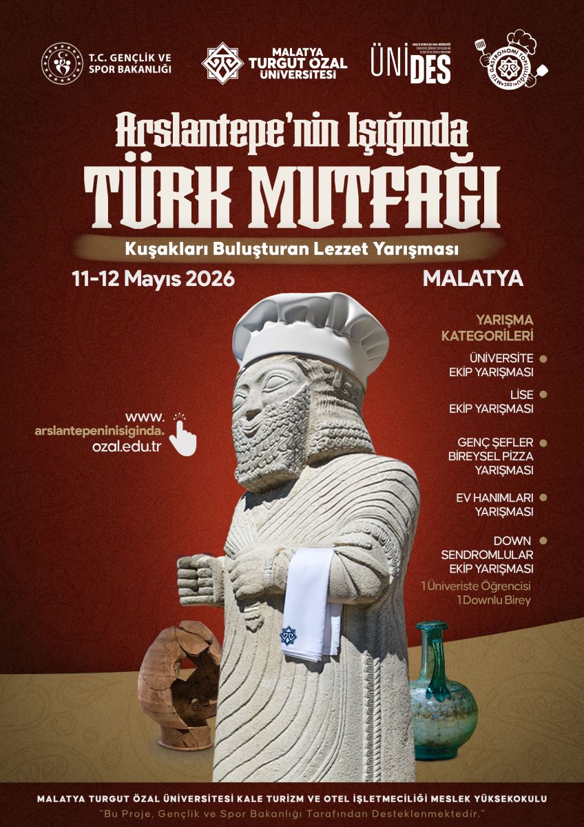 Malatya Turgut Özal Üniversitesi Gastronomi Topluluğu tarafından, Gençlik ve Spor Bakanlığının desteklediği ÜNİDES 6. Dönem Ulusal Projesi kapsamında, 11-12 Mayıs 2026 tarihlerinde "Arslantepenin Işığında Türk Mutfağı, Kuşakları Buluşturan Lezzet Yarışması" başlıklı bir yemek yarışması düzenlenecektir. Katılmak isteyen öğrencilerimize duyurulur.